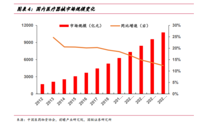 根据中国医药物资协会数据,中国医疗器械市场规模由2012年的1700亿元增长至2018年的5304亿元,年复增长率为20.88%。另外根据IMS数据,2015年我国医疗市场规模成为仅次于美国的全球第二大医疗器械市场。前瞻产业研究院发布的《中国医疗器械行业市场需求预测与投资战略规划分析报告》,预计未来五年(2019-2023)年均复合增长率约为14.41%,并预测在2023年我国医疗器械市场规模将突破万亿元,达到10767亿元。