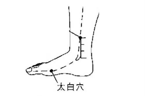 在足内侧大趾根部稍微突出的骨头后面,有一个太白穴,点揉太白穴可刺激足太阴脾经经气,促进脾运化水湿的功能,消除睡觉流口水症状。